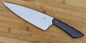 This 8-inch French Chef is a daily use item in our kitchen. It's great for everything from cutting onions to slicing meat and is thin, light and wicked sharp. Made with frame handle to protect it's hidden tang from water and corrosion, this knife weighs only 8.5 ounces. Handle slabs can be either presentation grade wood (Curly Maple, Curly Koa, African Blackwood, Figured Walnut, etc.) or Linen Micarta (Black, Maroon, Vintage or Green). Handle frames are all made from Micarta.